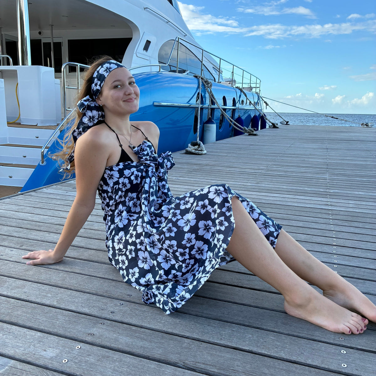 Un paréo léger et fluide en voile de coton, décoré d’un imprimé hibiscus tropical. Polyvalent, il peut se porter autour de la taille, en robe de plage ou en étole.