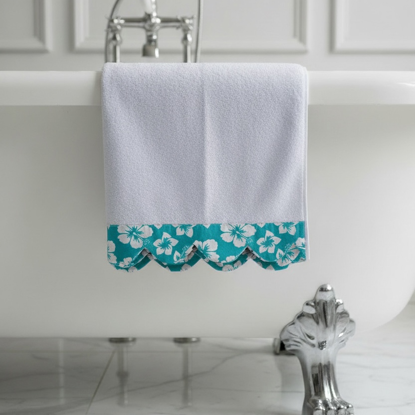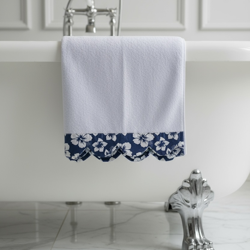 Apportez une touche d'élégance tropicale à votre salle de bain avec notre drap de bain en éponge, sublimé par une finition biais vague  imprimé hibiscus inspiré des îles. Un indispensable chic, doux et absorbant, idéal pour la maison ou la plage.