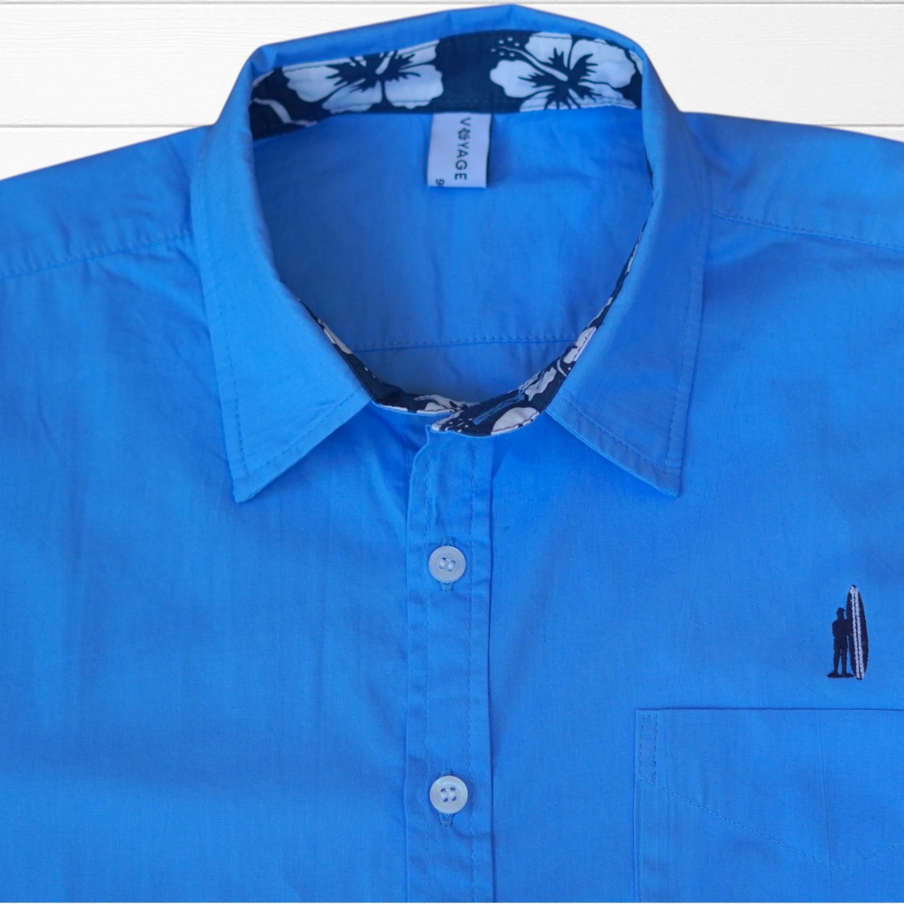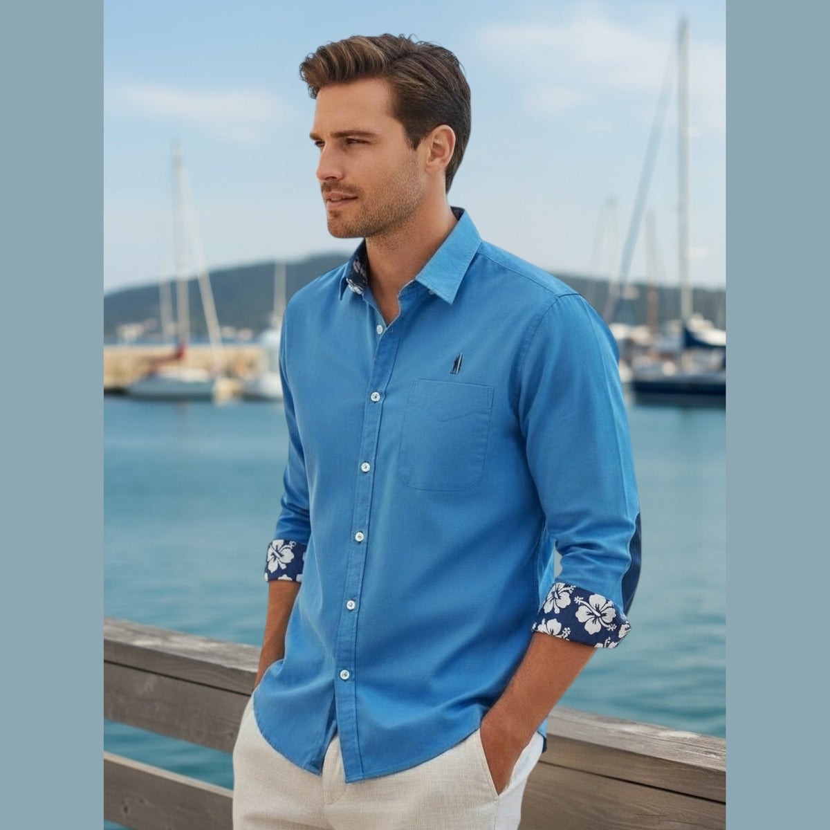 Chemiseclassiqueblancherevisitéeavecdesreversdemanchestissu impriméhibiscusetcoudièrescolorées.Unepiècequiapporteunetouchetropicalesubtileetéléganteàvostenues.">