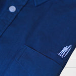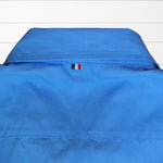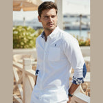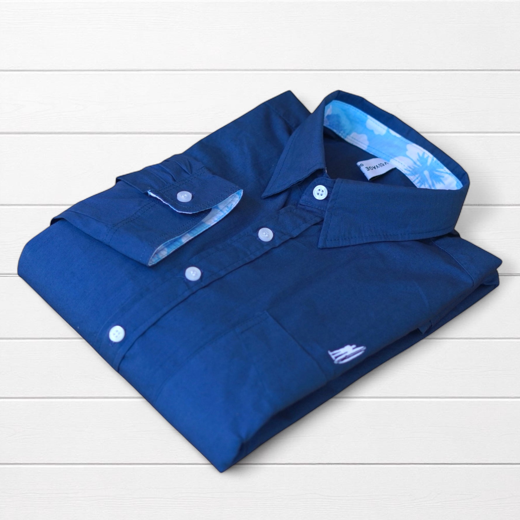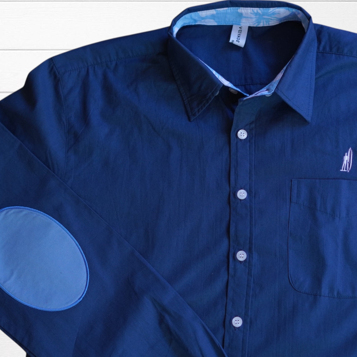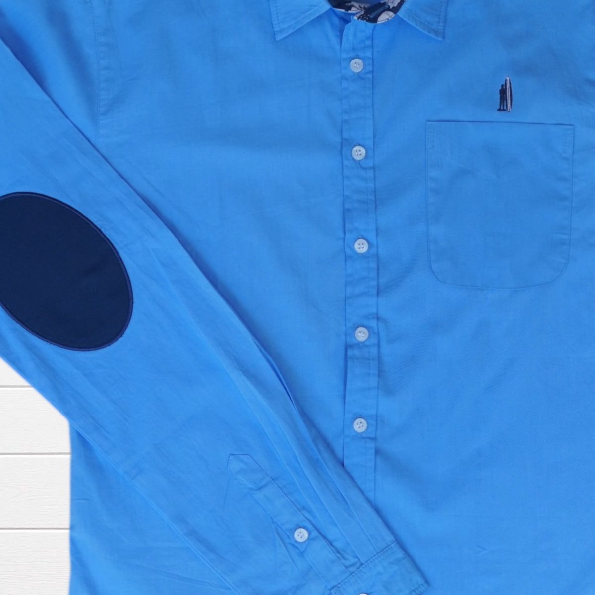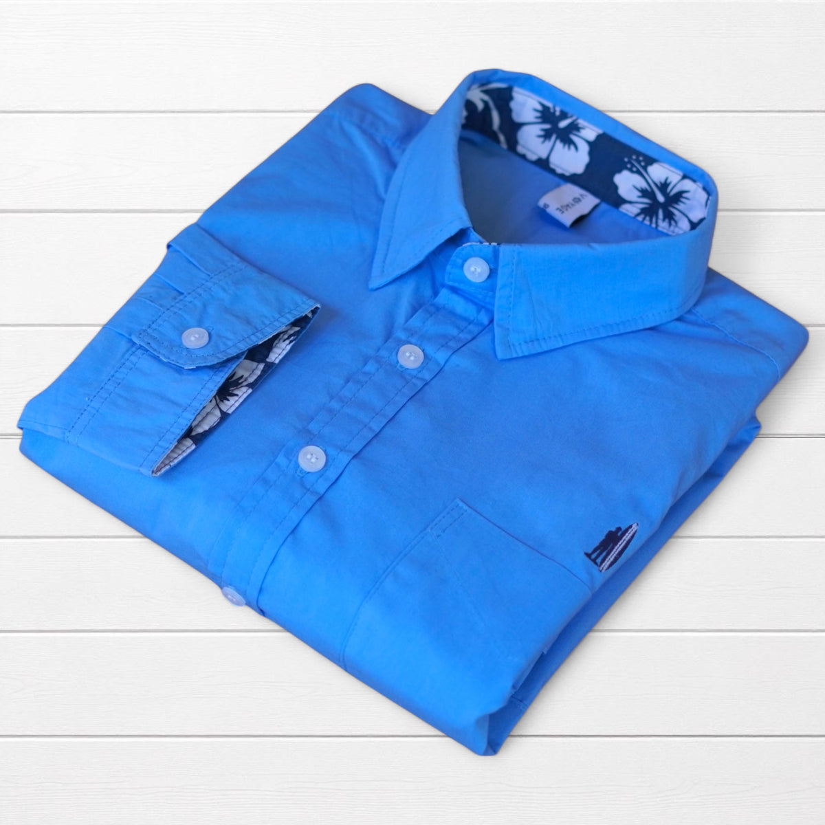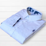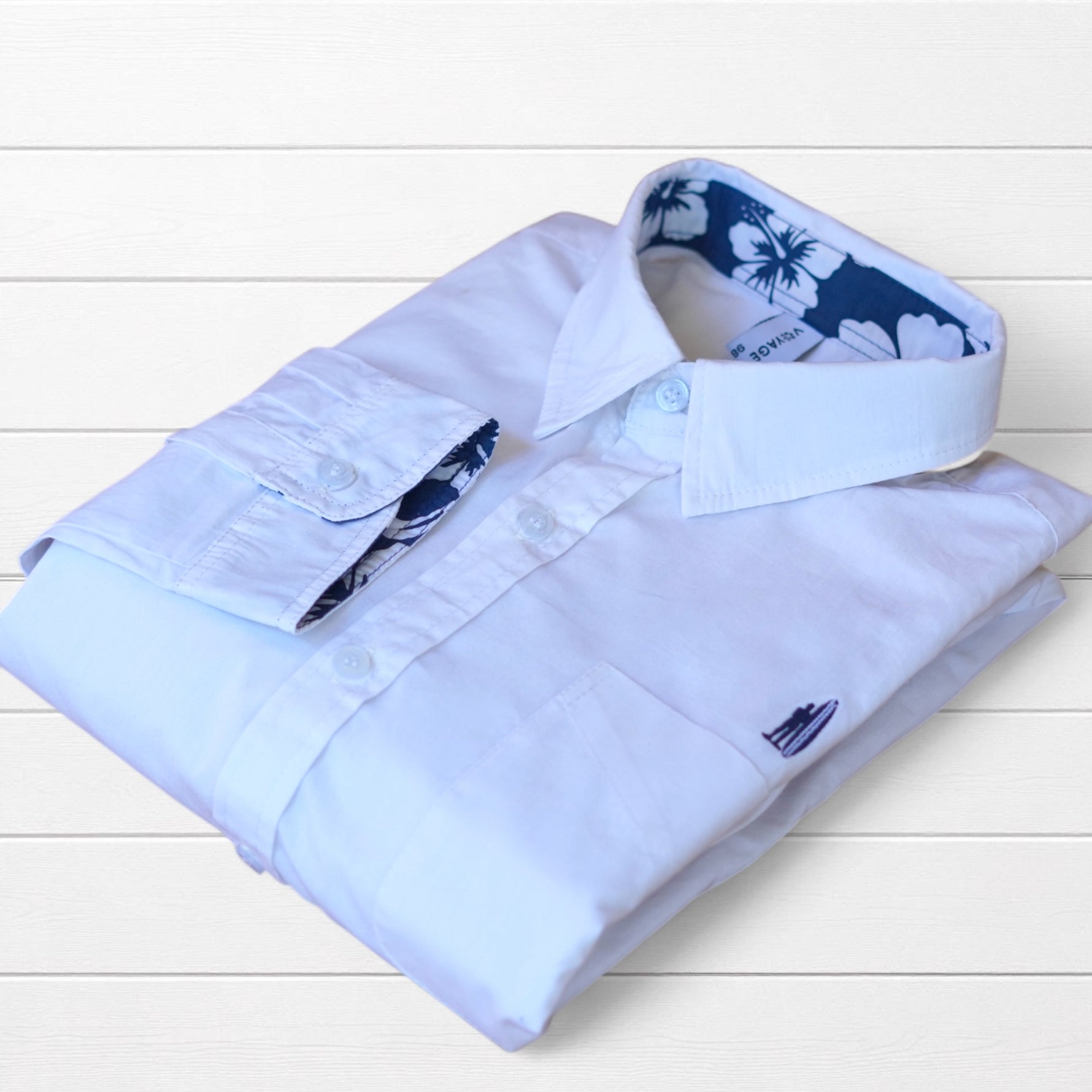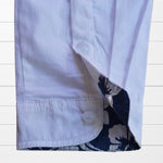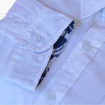 Chemise classique blanche revisitée avec des revers de manches tissu  imprimé hibiscus et coudières colorées. Une pièce qui apporte une touche tropicale subtile et élégante à vos tenues.