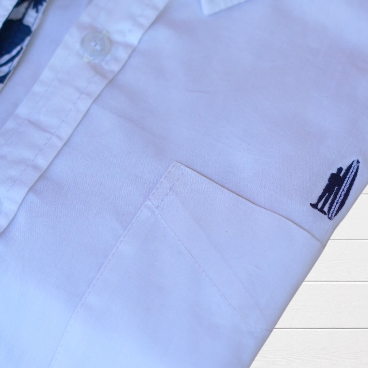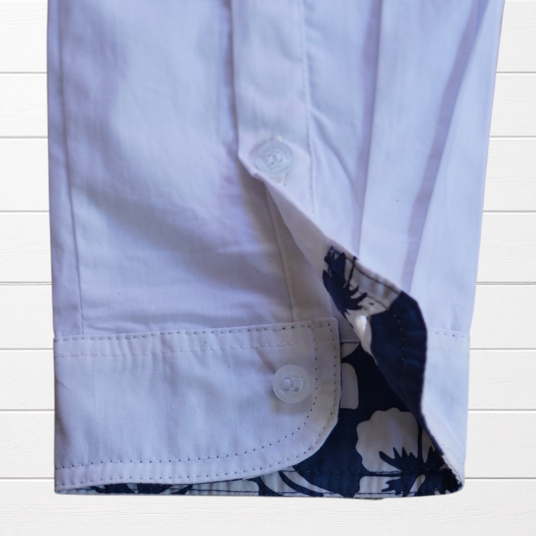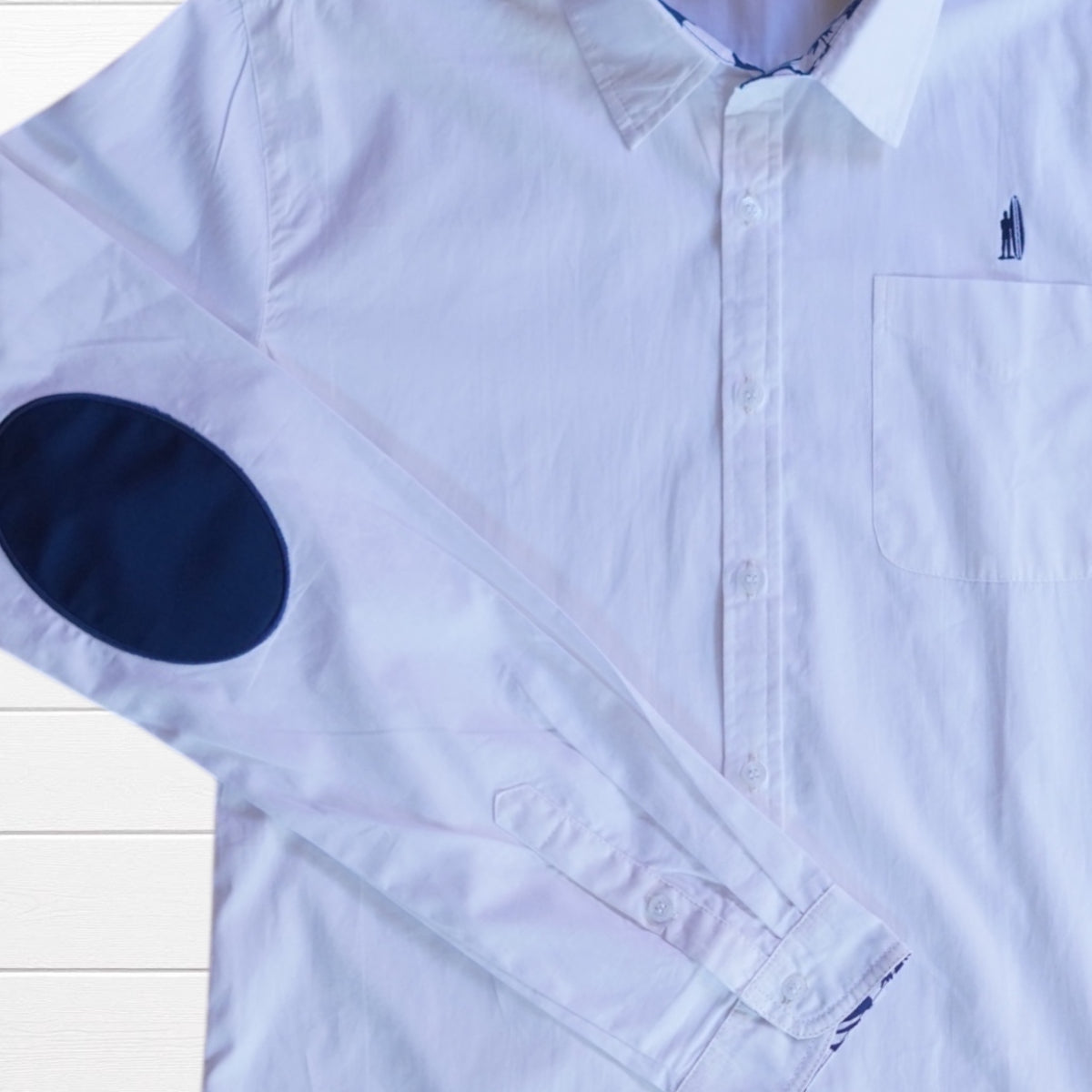inherit;">Chemise classique blanche revisitée avec des revers de manches tissu  imprimé hibiscus et coudières colorées. Une pièce qui apporte une touche tropicale subtile et élégante à vos tenues.