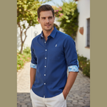 Chemise homme manches longues avec revers imprimé hibiscus et coudières